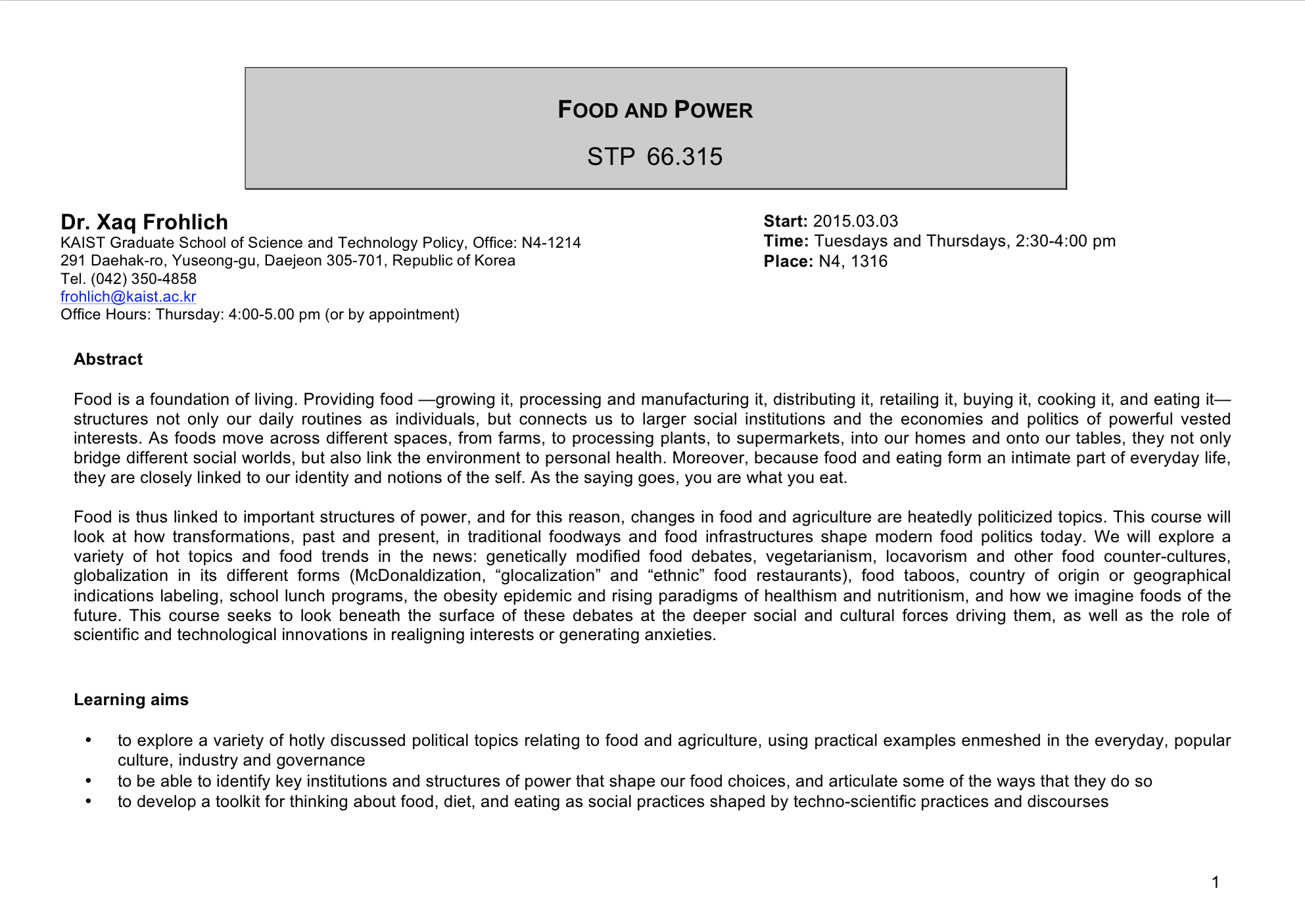 I’m here at KAIST STP on a two-year postdoc, which started last September, and it has been a wonderful environment to take my training in Science and Technology Studies and apply it to policy issues of concern in East Asia. The idea behind how I’ve organized this “Food and Power” class is to take many of the most salient political issues in food and agriculture today (e.g. GM foods, food security, nutritionism, industrial versus natural foods, vegetarianism, locavorism), and examine them using a variety of social science and humanities analytic tools, to consider the intersection of science and technology with human values. (That was a mouthful!)