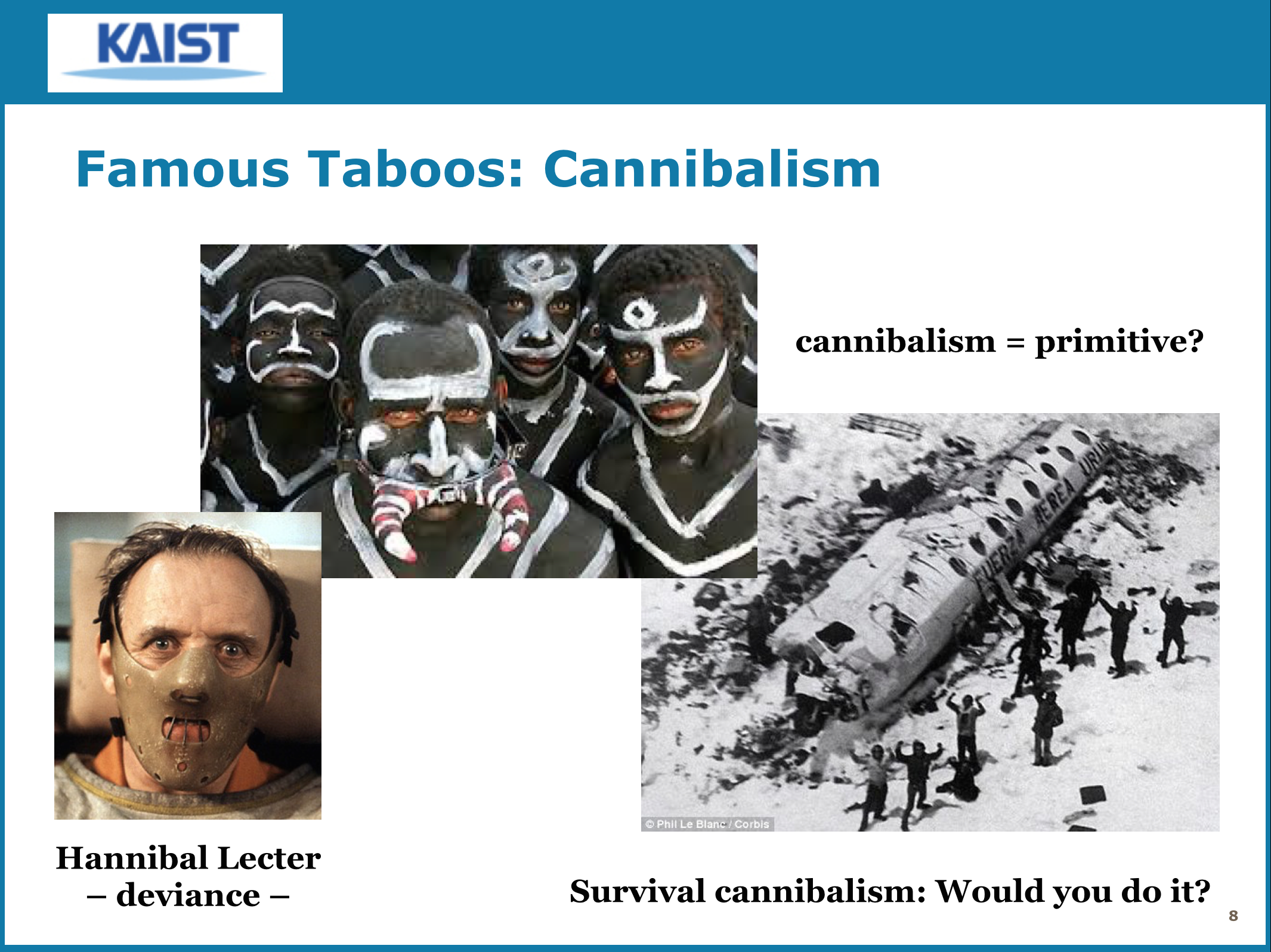 Of course we had to talk about the most famous food taboo… cannibalism. Why does it disgust us… because it’s deviant or primitive? And under what conditions could we overcome that (i.e. survival cannibalism)?