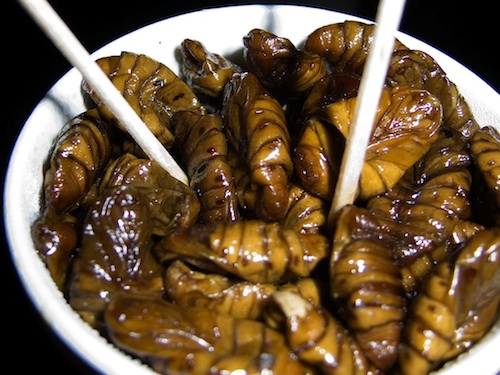 I chose the readings for this week to be a bit provocative, to see if I could get myself and my students “out of our comfort zone”. For this reason I had them read two pieces: Emily Anthes’s ‘modest proposal’ in The Guardian that we all learn to eat insects as a solution to the “Malthusian trap”: “How Insects Could Feed the World”; and “Chapter 4: Flesh” from Dale Peterson‘s excellent book Eating Apes. In Korea, many people eat silk worms as street food (“Beondegi”), so I imagined this would be an opportunity for the students to laugh at my squeamishness, and to explain to me why I should get over it, in the name of diversify my tastes and thereby saving the planet.